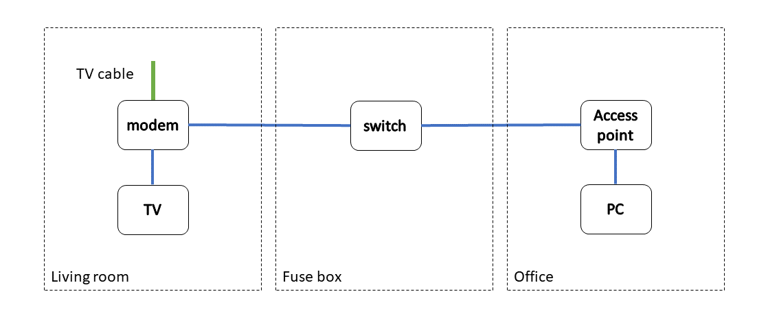 - The modem in the living room has a four-port switch. Two of these are taken up by the tv and the connection to the fuse box, but two remain for e.g. a game console.